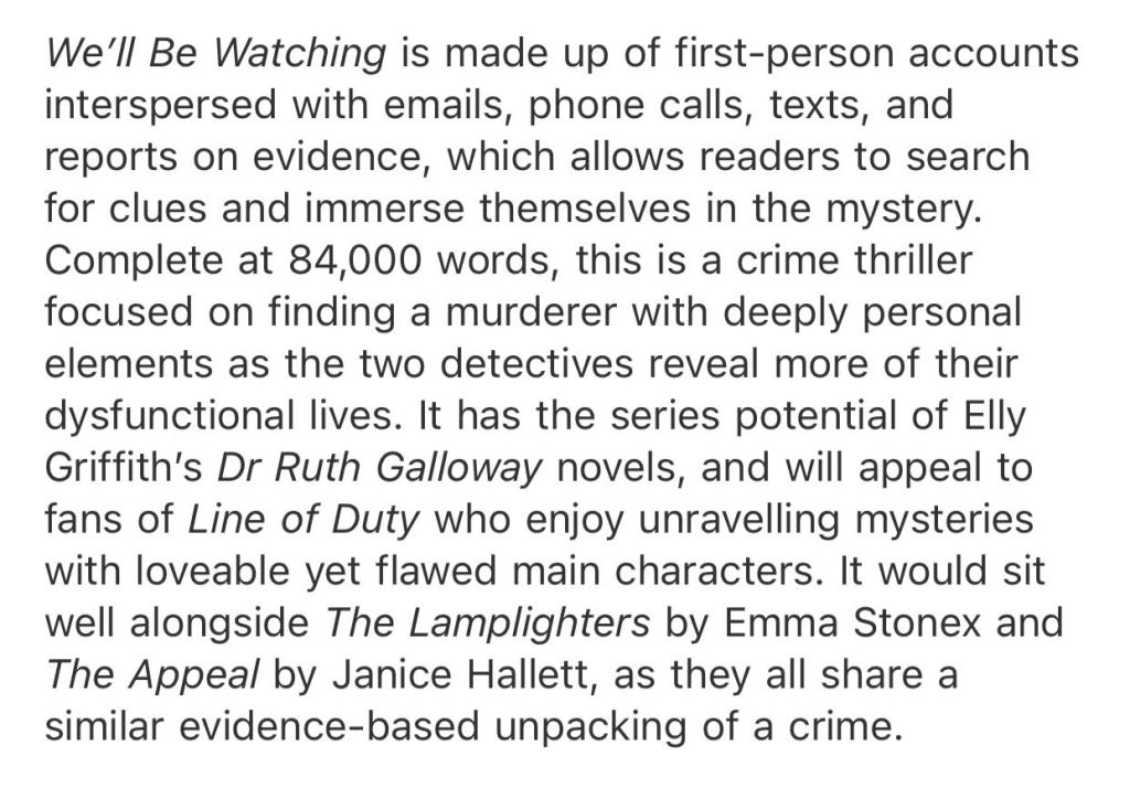 The rejections came first, and they didn’t pack quite as much of a punch as I’d expected them to. I think I was vaguely realistic about this part of the process – even if my novel was shit-hot (and I would go so far as to say it was quite good), then it wasn’t going to be everyone’s cup of tea. I really loved writing about a traumatised detective and interspersing the action with loads of emails and report and transcripts, but that wasn’t going to be what every agent I queried was looking for.