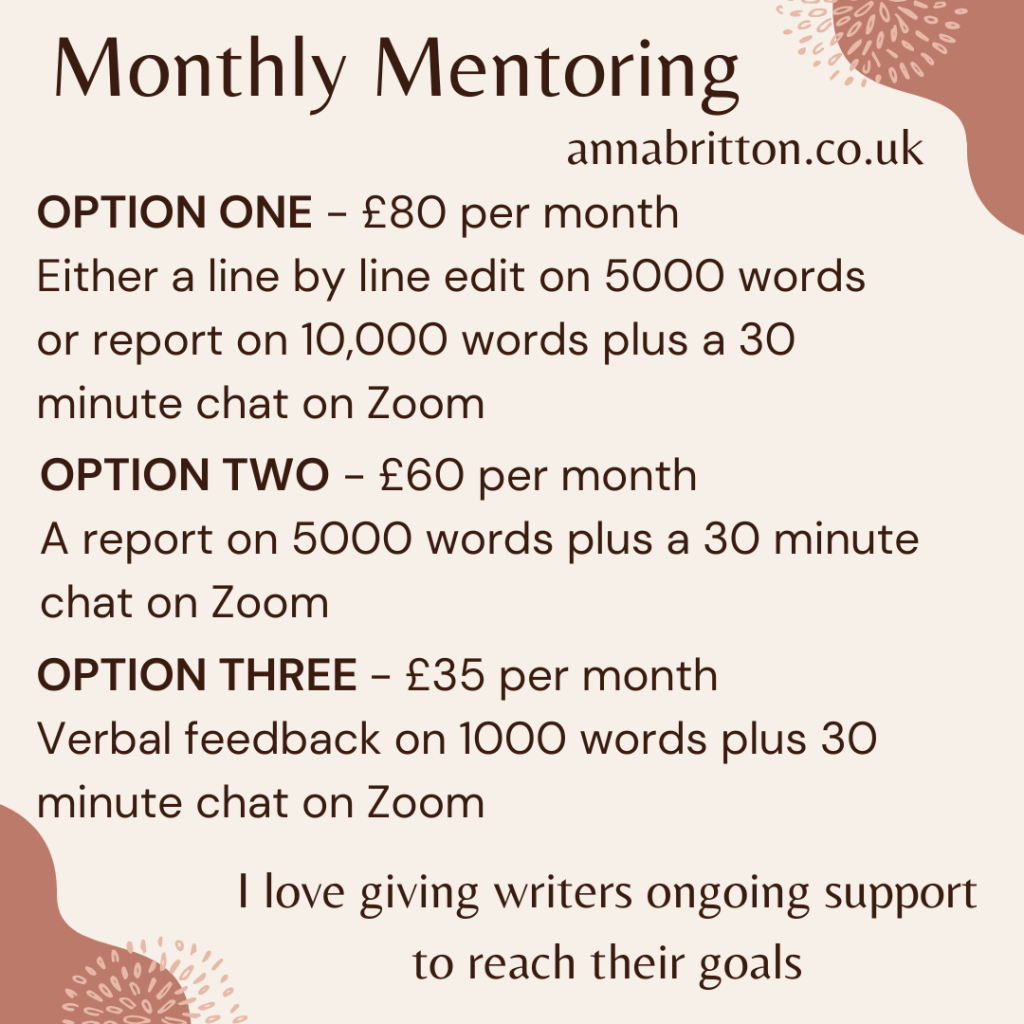 If you’re not looking for too much input but want someone to talk to about the ins and outs of writing, then I also offer monthly mentoring chats. You can send over 1000 words each month, which we will chat though, alongside goal setting and some cheerleading!
